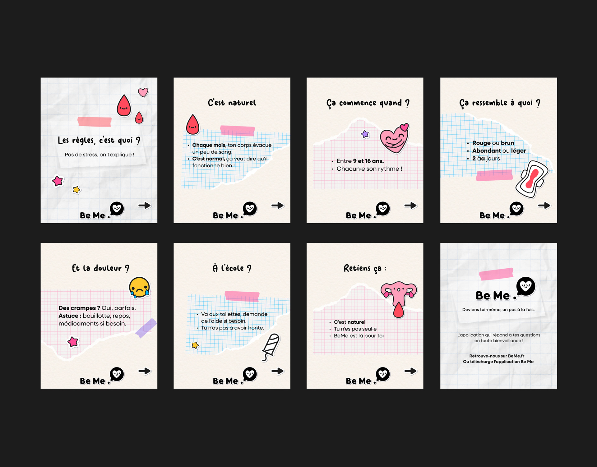 Pensé comme un espace bienveillant, inclusif et sans jugement, Be Me aborde des sujets souvent tabous comme : la sexualité, les poils, les menstruations, la contraception, les émotions ou encore l’identité de genre… À travers un ton doux, rassurant et accessible.