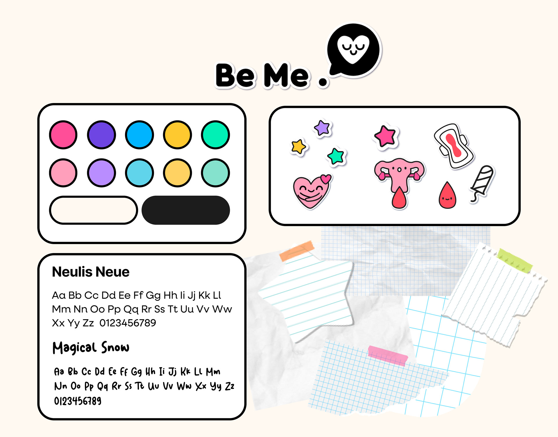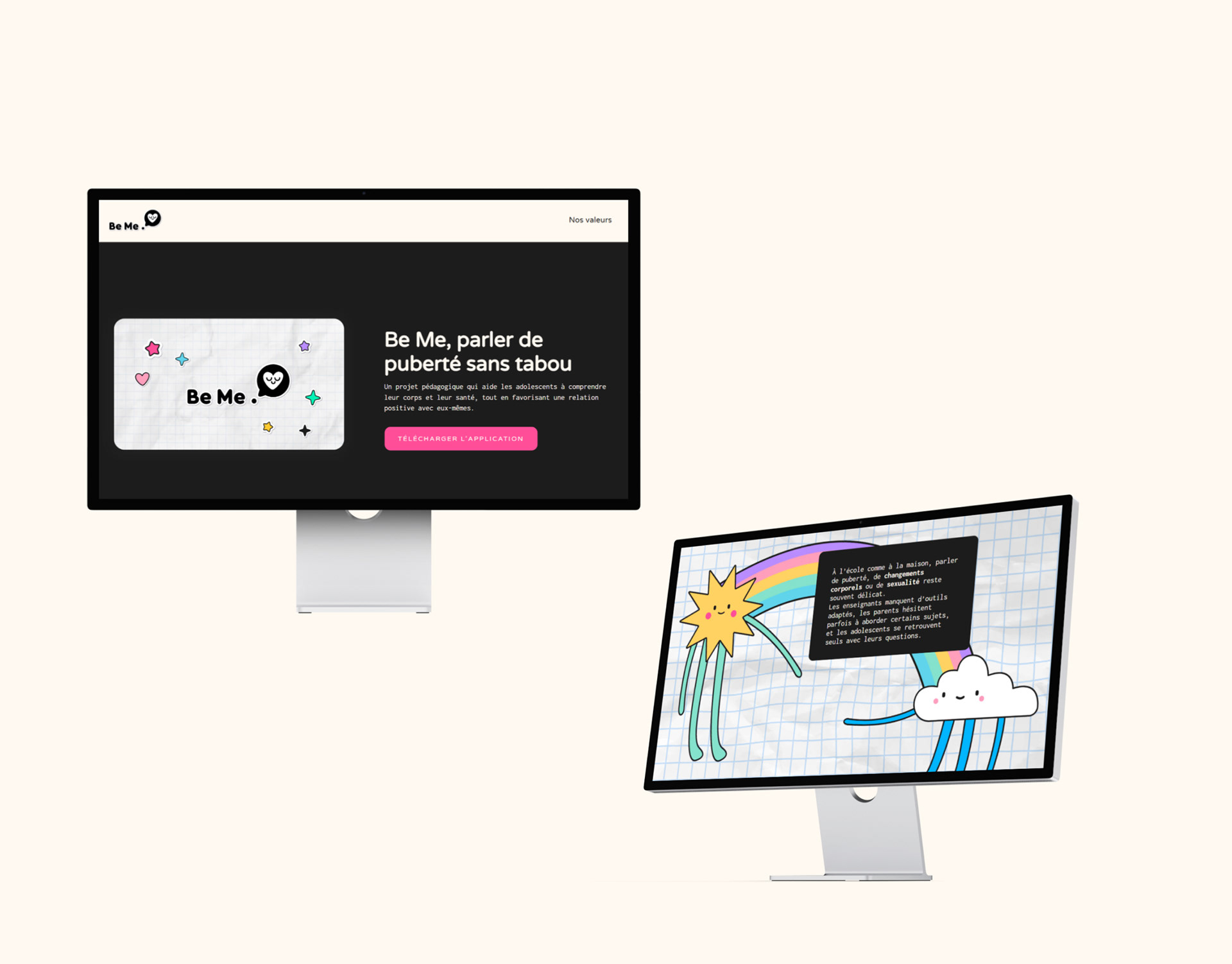 Be Me est un projet de design visant à accompagner les adolescents dans la découverte et la compréhension de leur puberté, afin de favoriser une relation positive avec leur corps et leur santé.