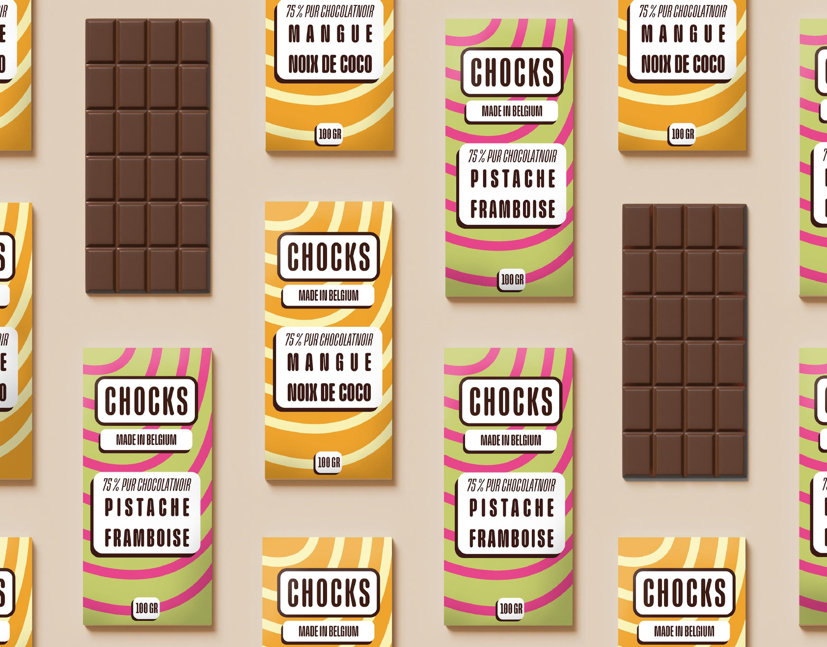 Chocks is a fictional brand of chocolate bars as part of a school project. In four hours we had to create a logo, packaging and a mockup. So I decided to go with a visual that could easily be adapted depending on the flavors.