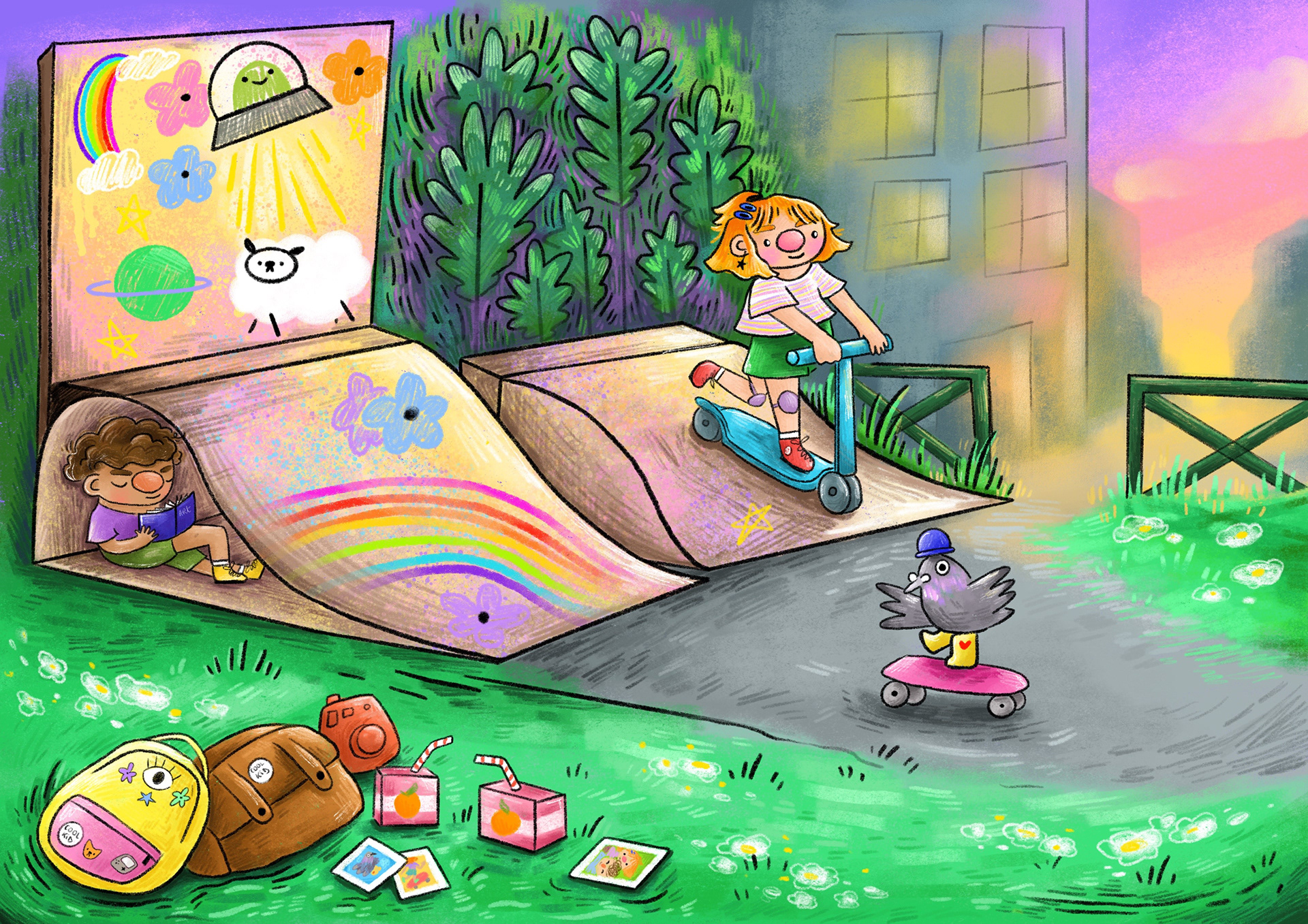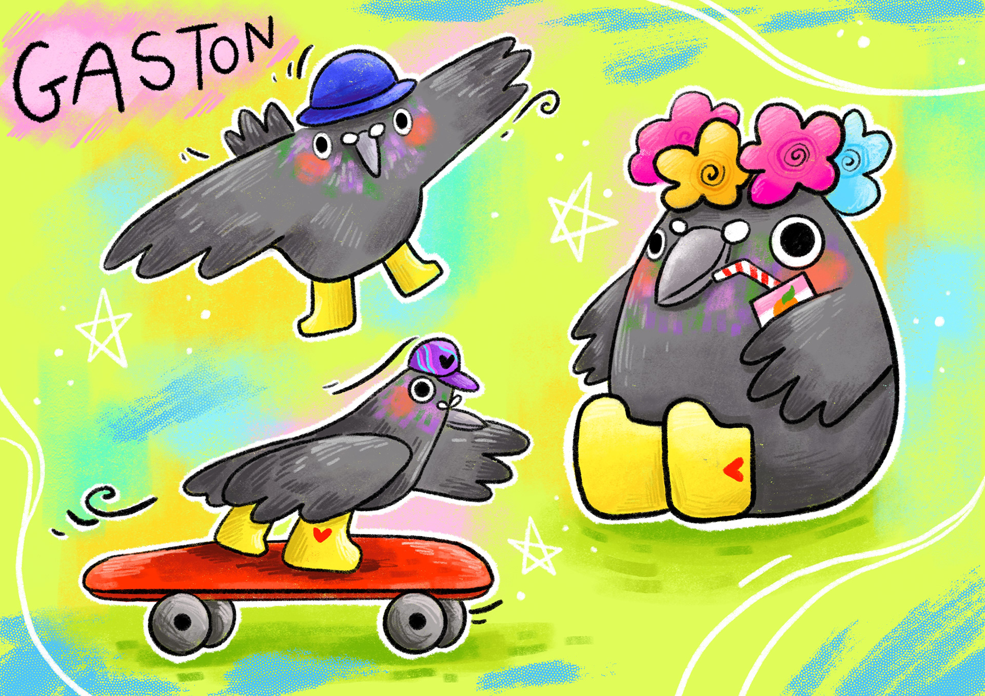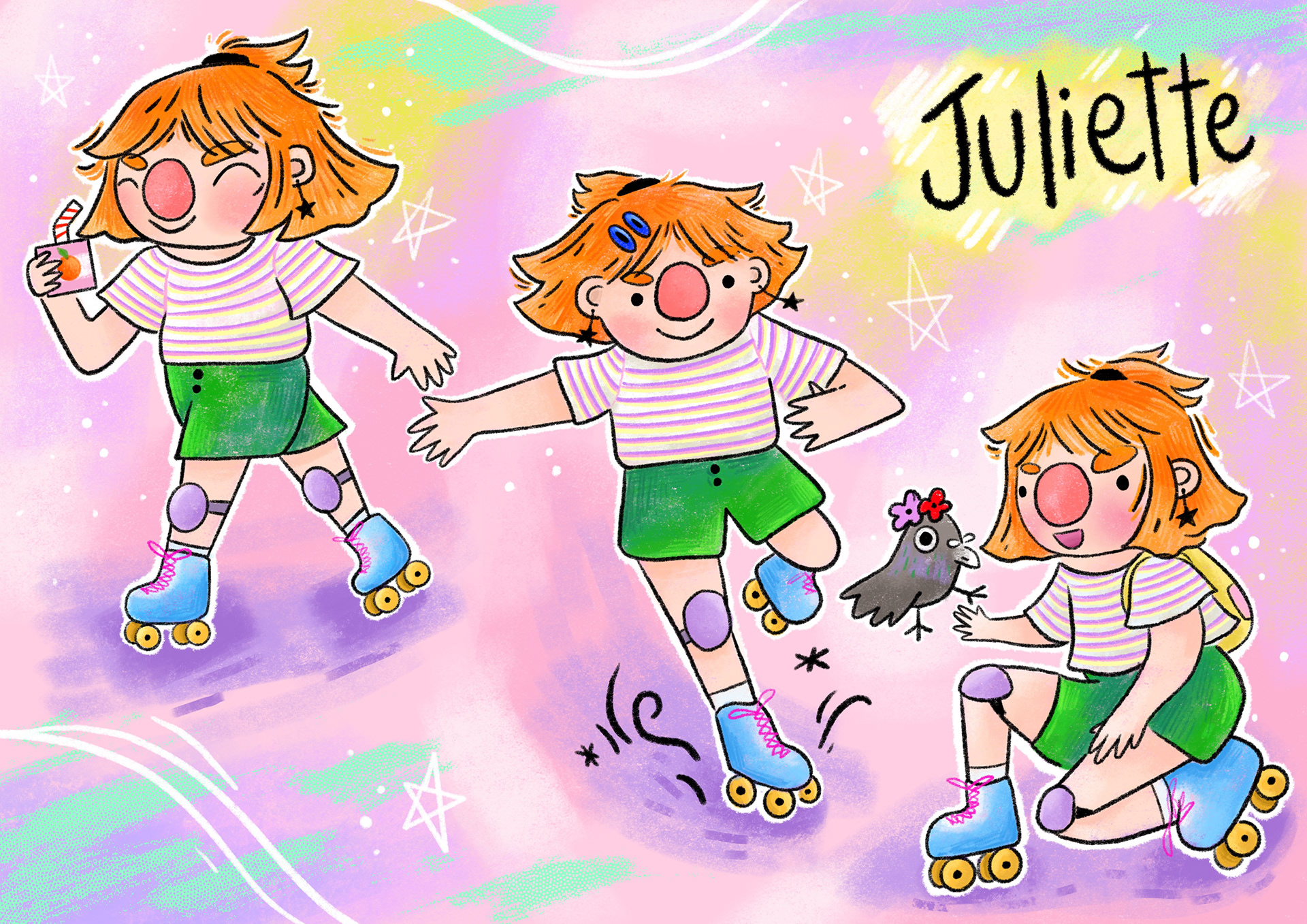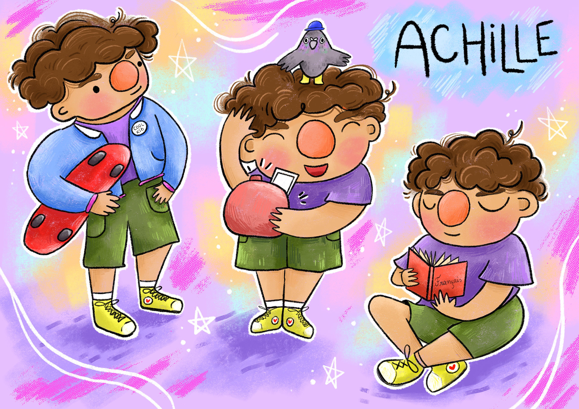 The characters are inspired by the 80s thanks to the intense colors. It matches well with the playful and dynamic side of the characters. This exercise allowed me to work on characters in action, rollerblading, skateboarding.