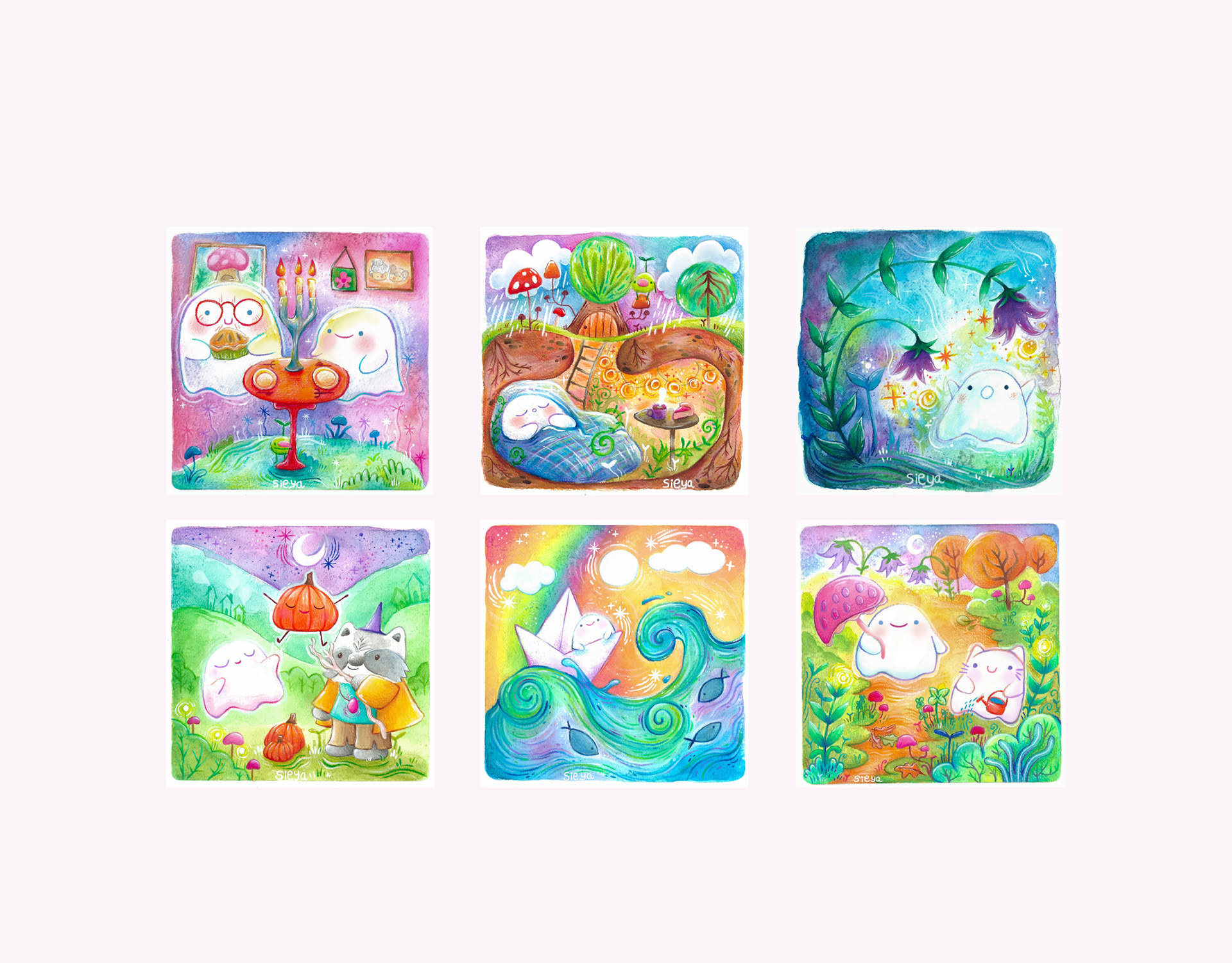 Collection of illustrations on the tribulations of Boowie the little ghost.