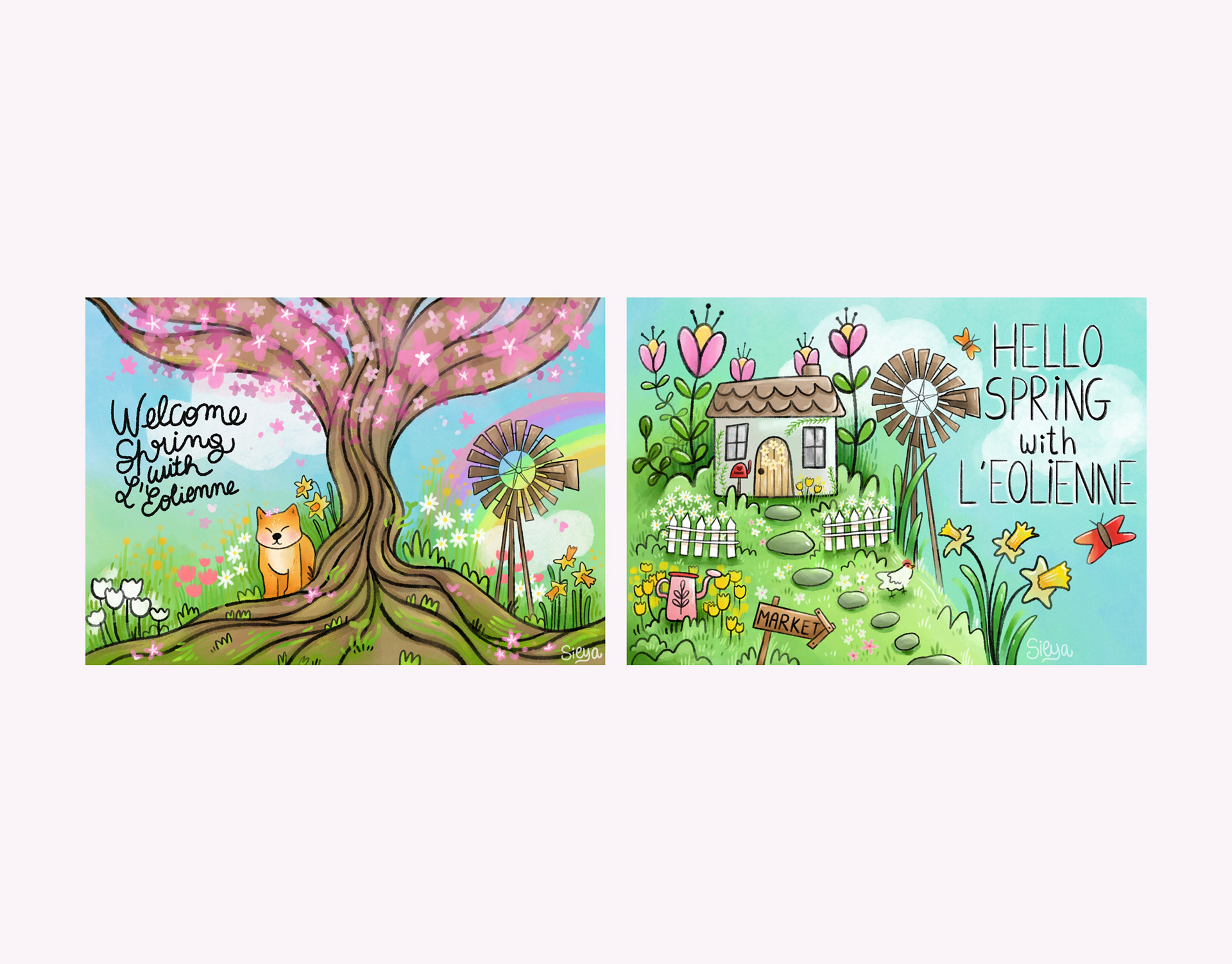 Spring-themed illustrations for the decoration shop " L'éolienne Market "